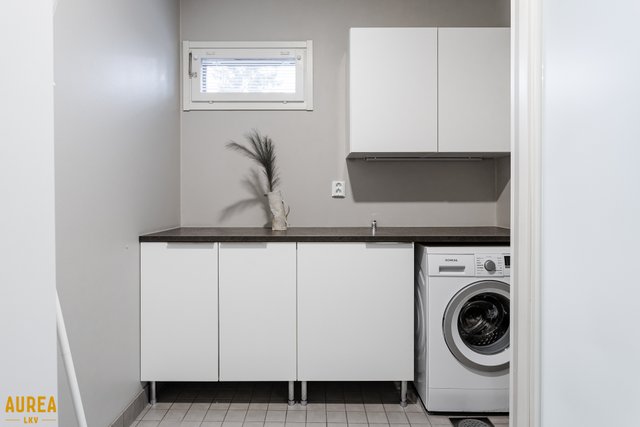 - Kodinhoitohuone omana tilanaan eroteltuna kylpytiloista. Kiintokalusteet ja tasotilaa.
