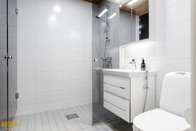 - WC-istuin, suihku, allaskaappi, peili, ja pesuallas