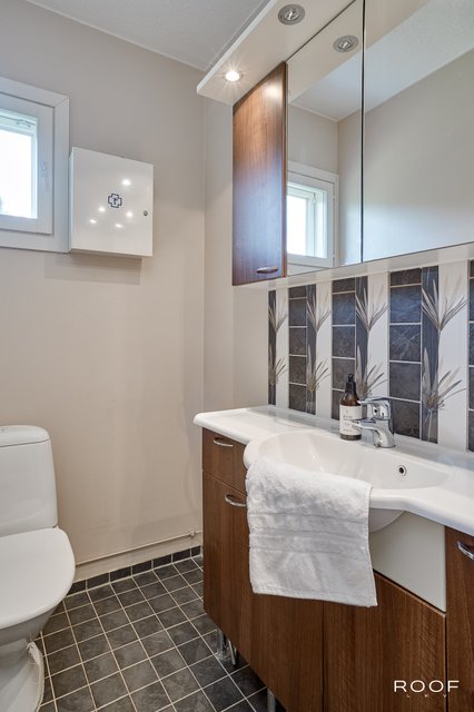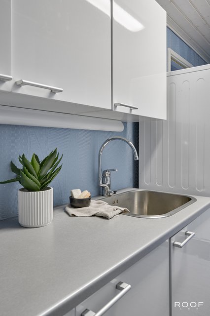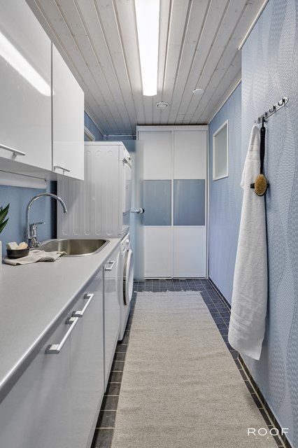 - Pesukoneliitäntä, pesuallas, lattialämmitys (sähkö), pyykkikaapit, lattiakaivo, ja pöytätaso