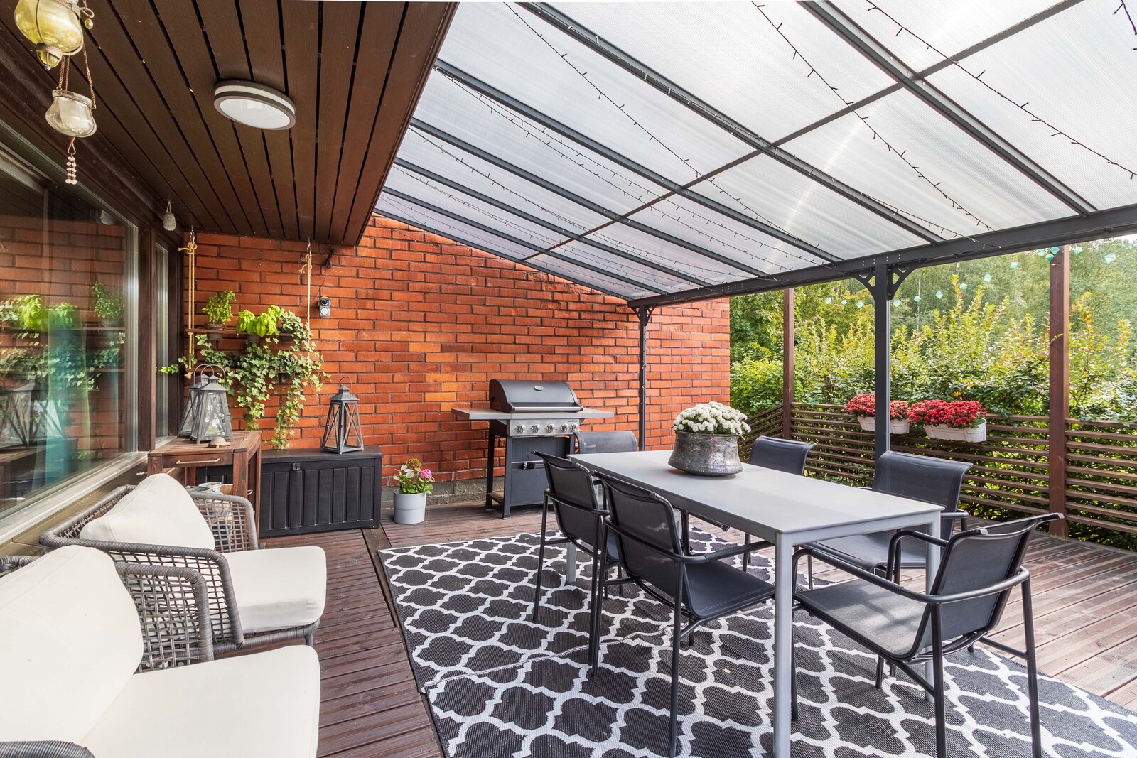 Aurinkoinen ja suojaisa piha osittain katetulla terassilla on täydellinen paikka lasten leikkeihin ja kesäisiin illanviettoihin. Talo sijaitsee rauhallisella, päättyvän tien varrella luonnonläheisessä ympäristössä. Yhtiöllä oma tontti.