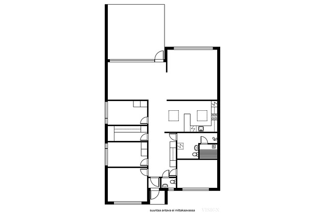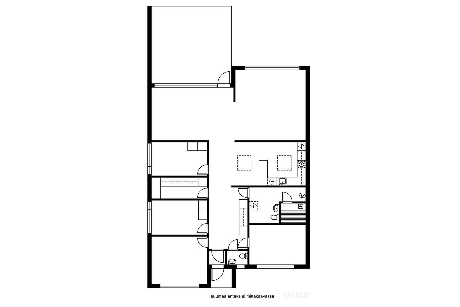 Moderni ja hyvin varusteltu avokeittiö kutsuu kokkailemaan ja viihtymään. Avara olohuone-ruokailutila yhdistelmä luo kodin sydämen - suuret ikkunat tuovat runsaasti luonnonvaloa ja luovat viihtyisän tunnelman. Neljä tilavaa makuuhuonetta tarjoavat jokaiselle oman rauhallisen sopen.