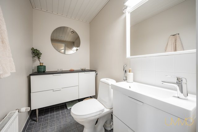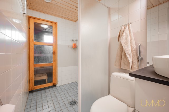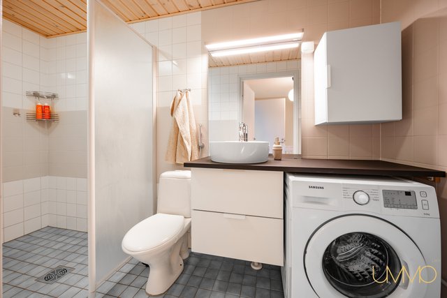 - Suihku, pesukoneliitäntä, lattialämmitys (Sähköinen ), allaskaappi, pesuallas, peili, kaapisto, ja suihkuseinä