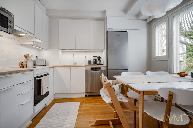 - Jääkaappipakastin (uusittu 2023), astianpesukone (uusittu 2025), uuni, ja liesituuletin (/talotuuletin 2023)