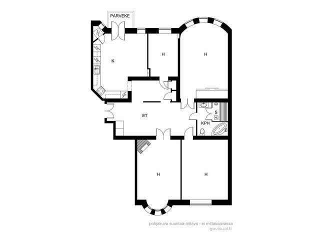 4 h, keittiö, kph/wc/sauna, eteishalli ja parveke