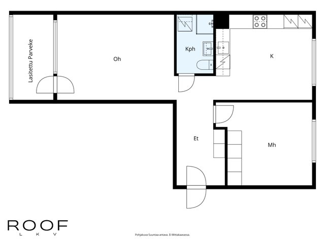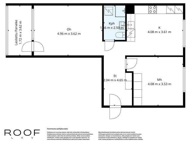 - Ei tarkistusmitattu. Pinta-alat saattavat tämän ikäisissä kohteissa (yhtiö rekisteröity ennen 01.01.1992) poiketa olennaisestikin asuinrakennusten nykyisten mittaustapojen ja standardien (SFS 5139) mukaan laskettavasta asuintilojen pinta-alasta. Pinta-ala voi siis olla edellä mainittua pienempi tai suurempi.