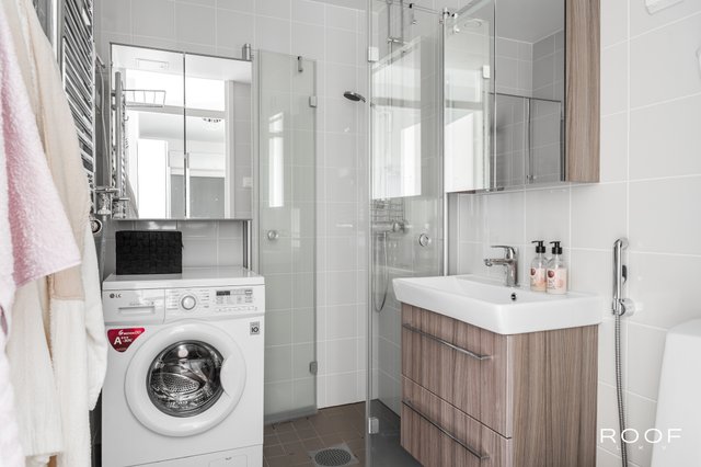 - Suihku, wc-istuin, suihkuseinä (Taittuvat suihkuseinät), pesukone, pesukoneliitäntä, lattialämmitys, peilikaappi, ja bidee-suihku