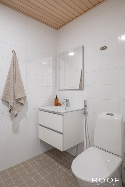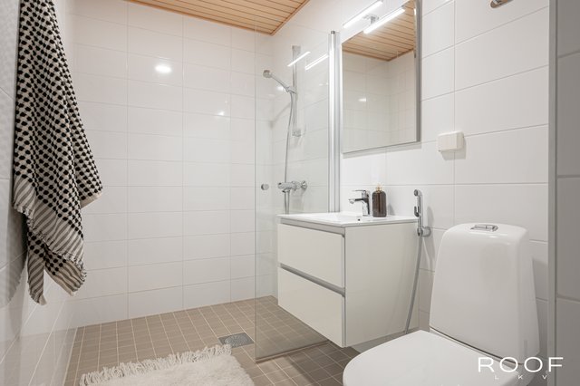 - Suihku, wc-istuin, pesuallas, allaskaappi, lattialämmitys, peili, ja bidee-suihku