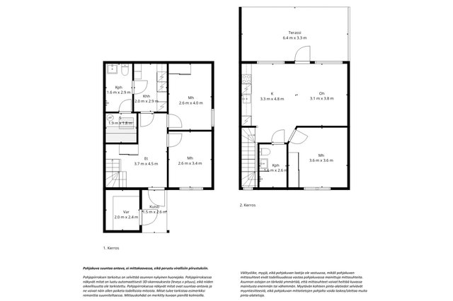 - Rakennuslupapiirrustusten mukainen huoneistoala tälle paritalon puolelle on 91 m² ja kerrosala 99,5 m² m². Rakennuslupapäätöksen mukainen kerrosala koko rakennukselle on 199 m² ja kokonaisala 231 m². Ei tarkistusmitattu. Pinta-ala voi siis olla edellä mainittua pienempi tai suurempi. Kohteen hinta ei perustu rakennuksen tai kiinteistön pinta-alaan.