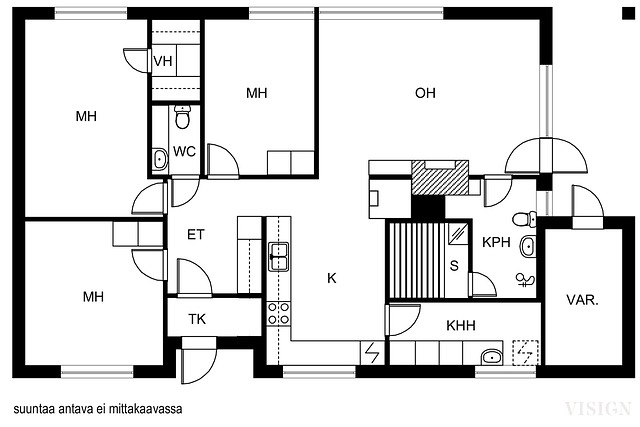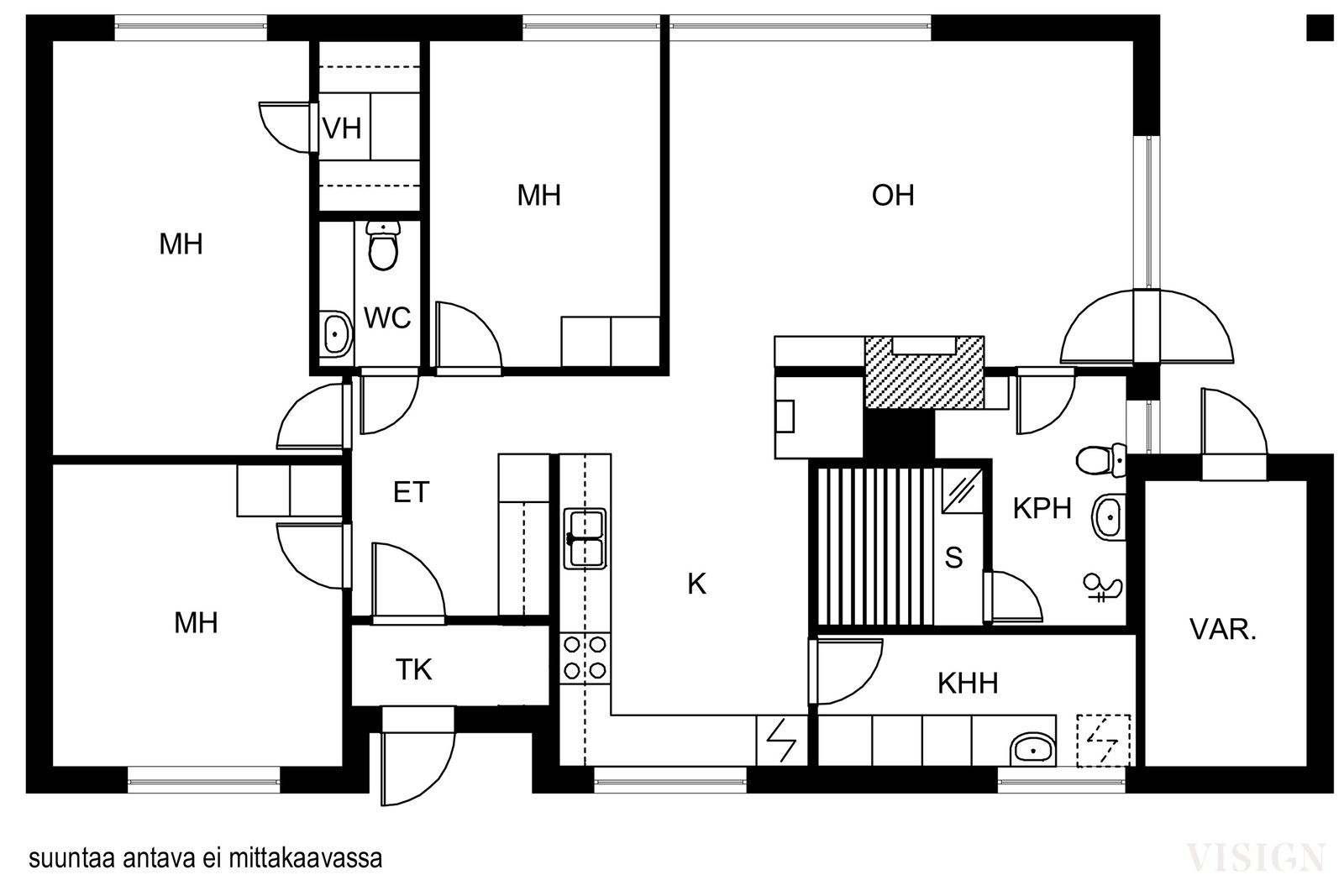 Tässä kodissa on kolme makuuhuonetta, erillinen leivinuunilla varustettu keittiö ja olohuone, jossa varaava takka. Olohuoneesta kulku eteläsuuntaisella terassille. Erillinen wc ja keittiön yhteyteen sijoittuva kodinhoitotila sujuvoittavat perhearkea. Säilytystilaa sekä vaatehuoneessa että varastossa. Näiden lisäksi etupihalle on sijoitettu erillinen autotalli.