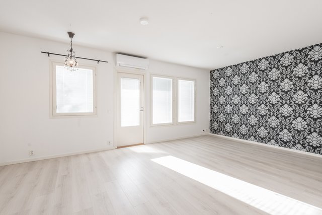 - Tilava olohuone, josta käynti takapihan avoterassille