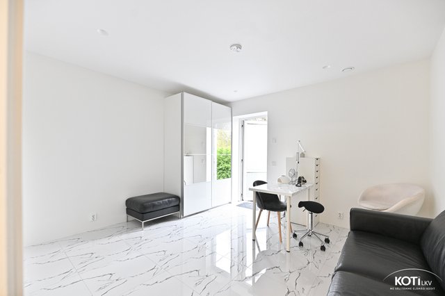 Sisääntulokerroksessa odottaa monikäyttöisiä tiloja arjen eri tarpeisiin. Tilava takkahuone toimii mainiosti esimerkiksi arkiolohuoneena, vierastilana tai harrastehuoneena. Kodinhoitohuone on suunniteltu toimivaksi ja arkea helpottavaksi kokonaisuudeksi. Lisäksi noin 15 m²:n kokoinen varastohuone palvelee tällä hetkellä työhuoneena. Kaikista näistä tiloista on oma uloskäynti suoraan pihalle, mikä lisää niiden käytännöllisyyttä ja monipuolisuutta.