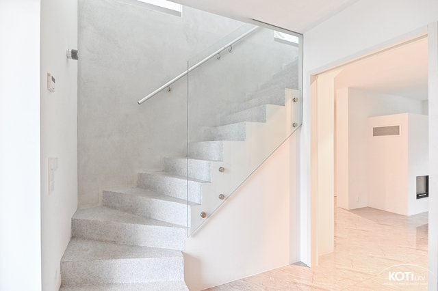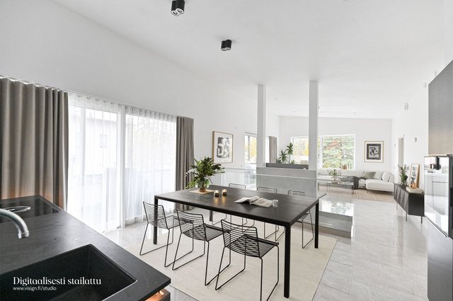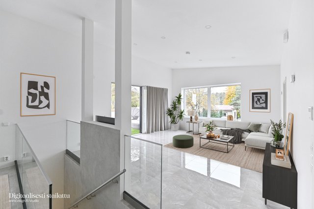 - Valoisa ja avara olohuone, josta liukuovet terassille. Aurinkoinen eteläterassi autokatoksen päällä, joka tarjoaa runsaasti luonnonvaloa koko päiväksi. Olohuone ja keittiö yhtenäistä avointa tilaa. Tyylikäs portaikko erottaa olohuoneen keittiöstä.