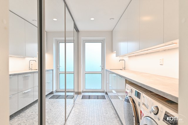 - Sisääntulokerroksessa todella toimiva kodinhoitohuone. Paljon säilytystilaa, vesipiste, kurasyöppö ja pesukoneliitäntä.