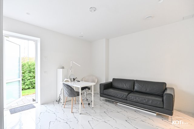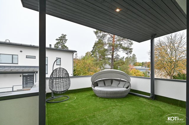 Avara olohuone ja tyylikäs Häcker-keittiö muodostavat yhtenäisen, valoisan kokonaisuuden, josta on liukuovien kautta suora käynti terassille. Autokatoksen päällä sijaitseva iso, etelään avautuva kattoterassi tarjoaa ihanteelliset puitteet auringonottoon, grillaamiseen tai rentoutumiseen omassa rauhassa.