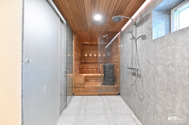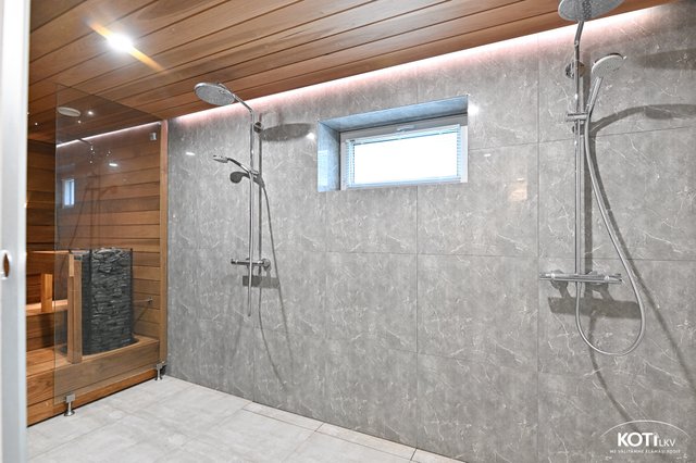 - Kylpyhuone kummassakin kerroksessa. Saunan yhteydessä olevassa kylpyhuoneessa kaksi sadesuihkua. Yläkerran kylpyhuoneessa suihku, suihkuseinä, käsienpesuallas, peili ja wc-istuin.