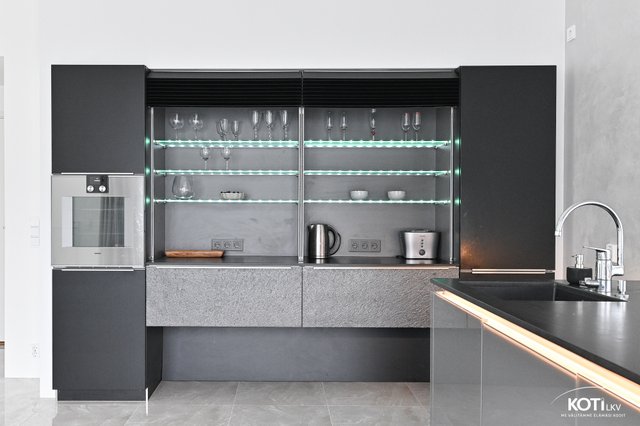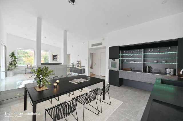 - Laadukas Häcker-keittiö varusteena Boch-jääkaappi/pakastinyhdistelmä, Boran keraaminen liesi, Gaggenaun liesitaso, upotettu liesituuletin, astianpesukone (Gaggenau) sekä puristekivitasot. Iso saareke (siirrettävä) tuo lisää säilytys- ja työskentelytilaa. Keittiöstä liukuovet terassille.