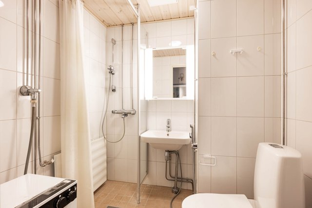 - WC-istuin, suihku, suihkuseinä, pesukoneliitäntä, peilikaappi, pesuallas, ja bidee-suihku