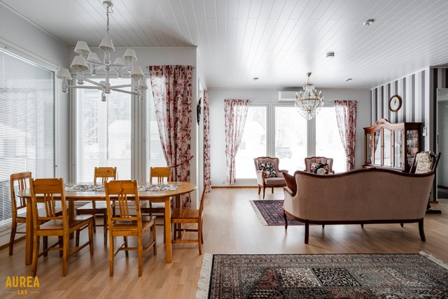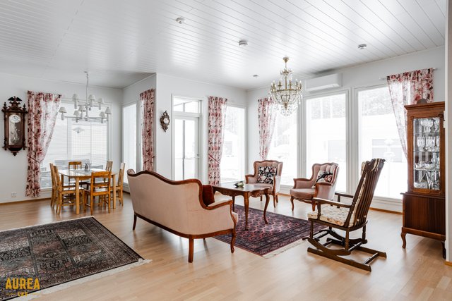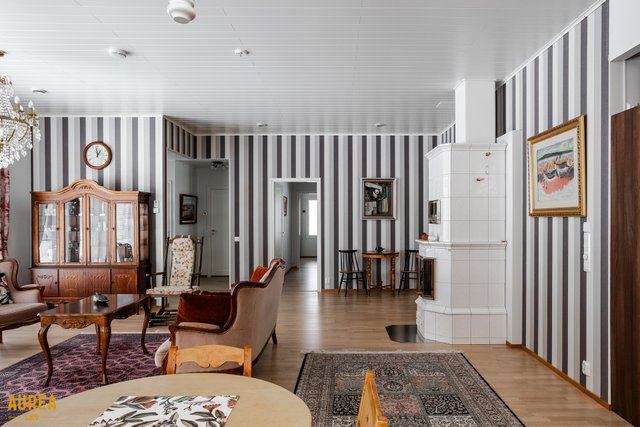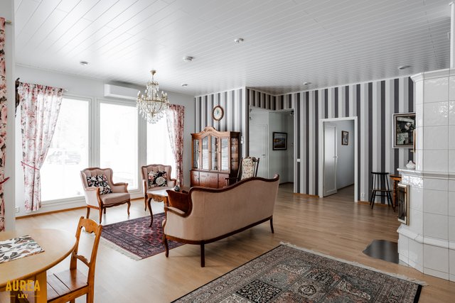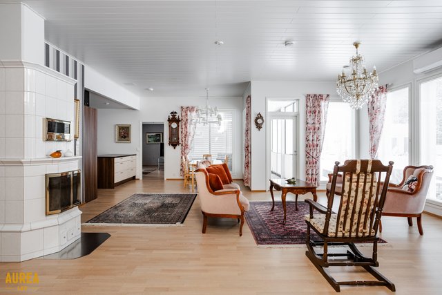 - Reilun kokoinen, 37,4 m²:n olohuone hurmaa korotetulla katollaan ja avaruuden tunnullaan. Huoneen keskipisteenä toimii todella tyylikäs varaava takka, joka luo tunnelmaa ja lämpöä.
