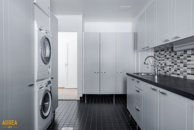 - Pesukoneliitäntä, pesuallas, lattiakaivo, pyykkikaapit, pöytätaso, tila pesutornille, integroitu mankeli, silityspöytä/taso, ja lattialämmitys