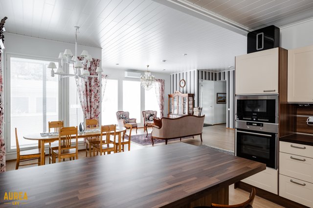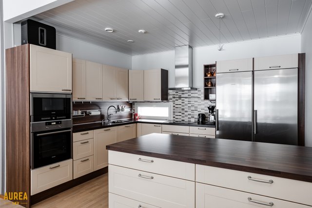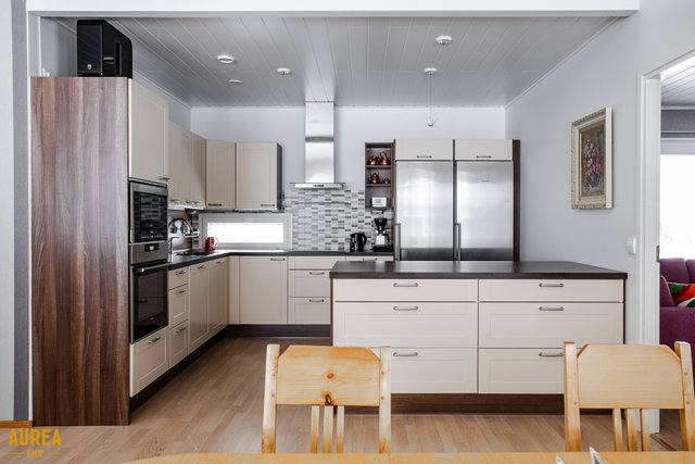 - Laadukas Puustellin keittiö avautuu saumattomasti olohuoneen yhteyteen luoden viihtyisän ja toimivan kokonaisuuden. Osittain integroidut kodinkoneet viimeistelevät ilmeen.