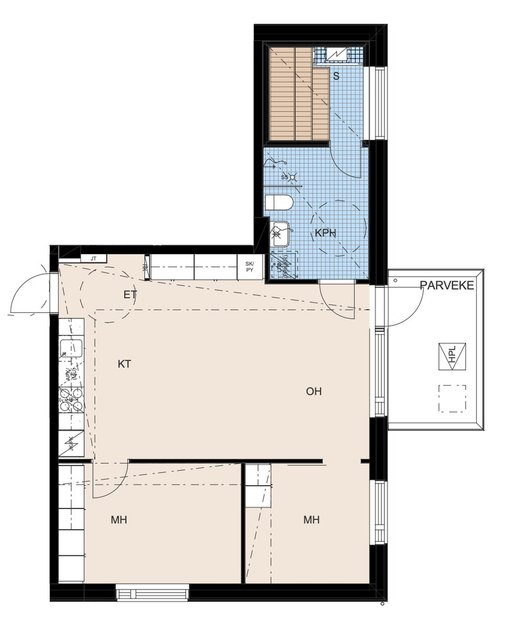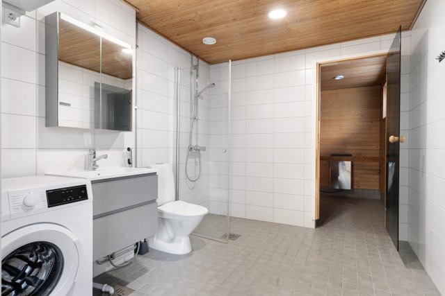 - WC-istuin, suihku, pesukoneliitäntä, lattialämmitys, peilikaappi, allaskaappi, ja bidee-suihku