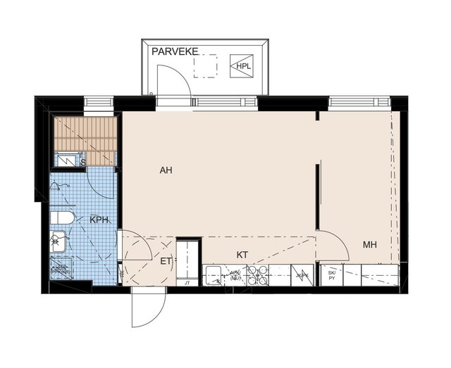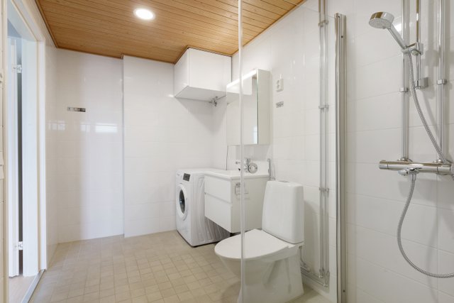 - WC-istuin, suihku, pesukoneliitäntä, lattialämmitys, peilikaappi, allaskaappi, ja bidee-suihku