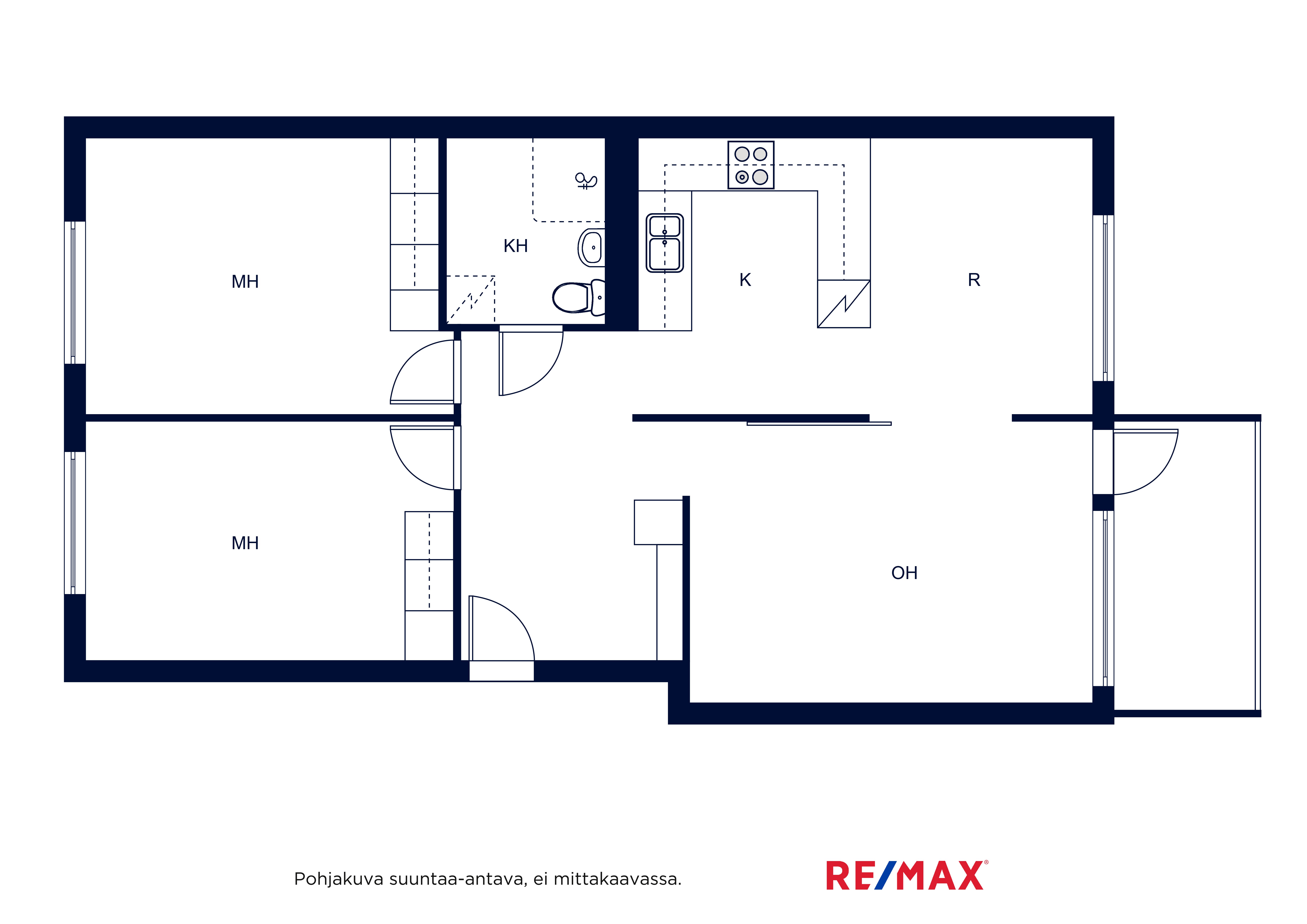 Pohjaratkaisu on joustava: kolmas makuuhuone on helposti toteutettavissa, mikä lisää asunnon arvoa ja käyttömukavuutta.