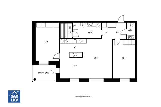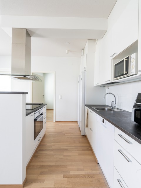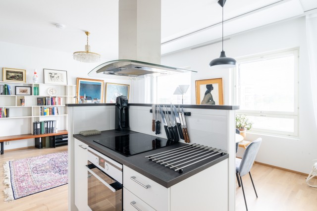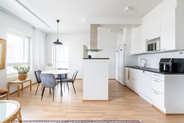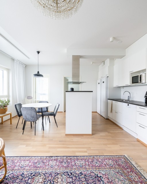 - Toimiva keittiö, jossa erillisessä saarekkeessa pöytätilaa ja erillisuuni. Induktio-tasoliesi, täyskorkea jääkaappi ja -pakastin, astianpesukone. Koko asunnossa on parkettilattiat.