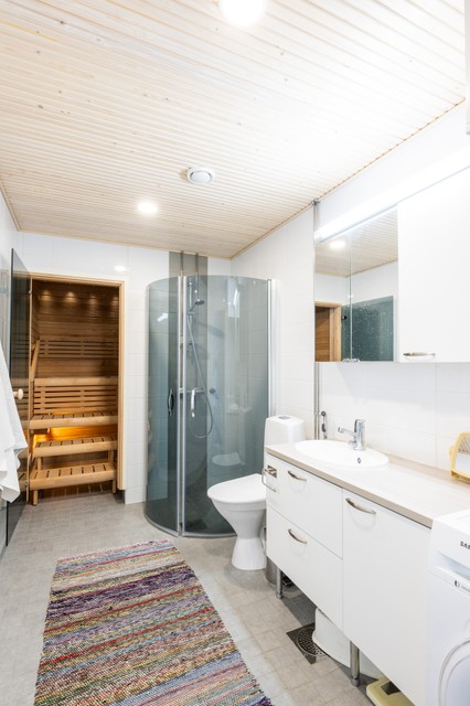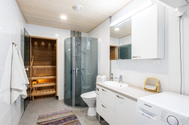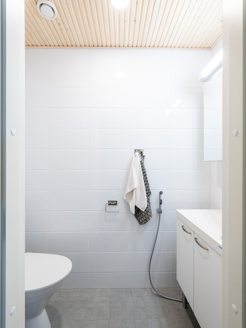 - WC-istuin, suihku, suihkuseinä, peilikaappi, pesuallas, bidee-suihku, allaskaappi, ja lattialämmitys