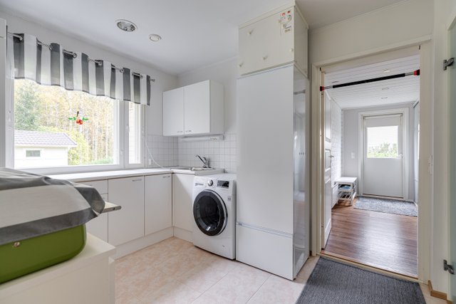 - Pesukone, pesukoneliitäntä, lattialämmitys, pesuallas, lattiakaivo, silityspöytä/taso, pöytätaso, ja tila pesutornille