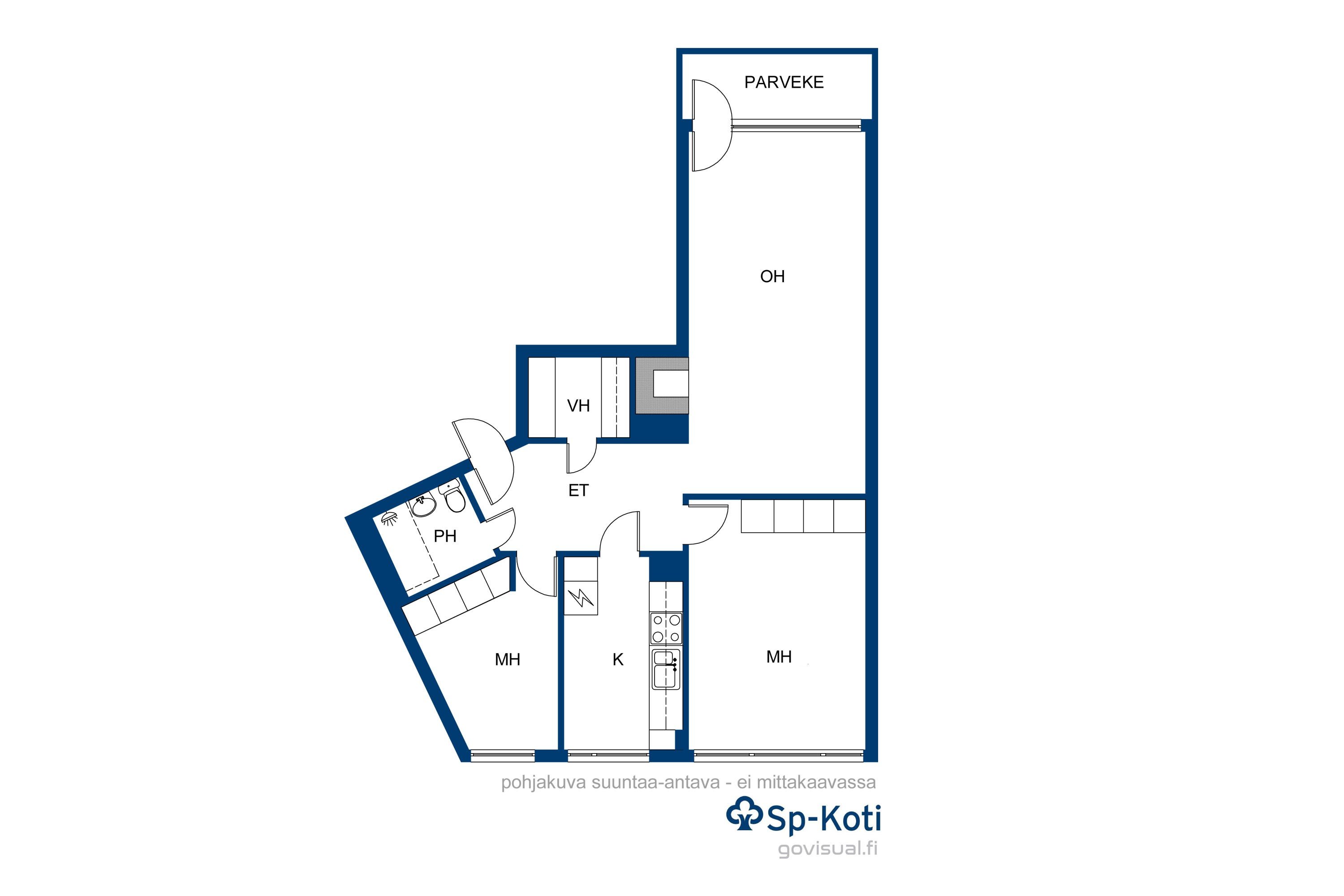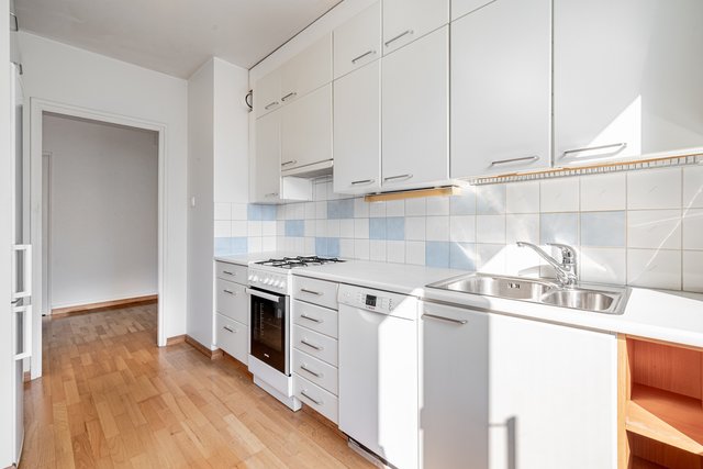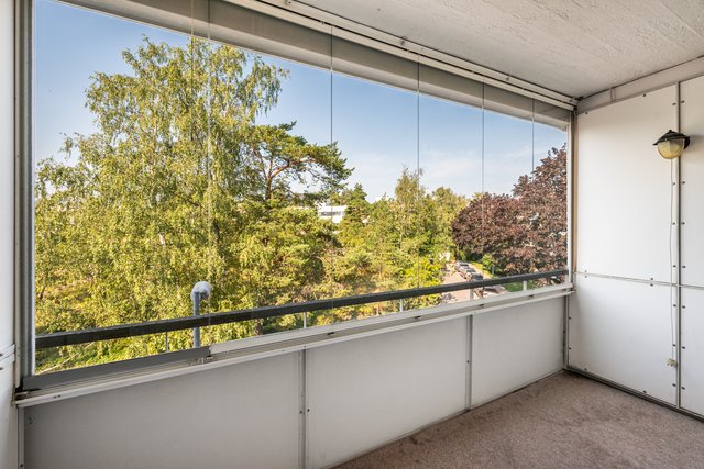 Tilava olohuone on kodin sydän, jossa tunnelmaa luo avotakka. Olohuoneesta on käynti lasitetulle parvekkeelle, joka avautuu luoteeseen – täydellinen paikka nauttia ilta-auringosta. Erillisessä keittiössä on kaikki tarvittavat varusteet, ja kaksi makuuhuonetta ovat molemmat omassa rauhassa eri puolilla asuntoa.