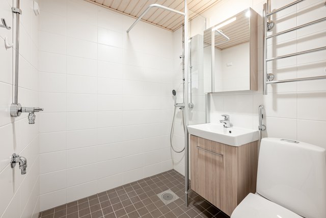 - Kylpyhuone, jossa varusteina pesukoneliitäntä, kuivauspatteri, bidee-suihku, allas/allaskaappi, peilikaappi, suihkuseinä, suihkuverhon tanko, suihku ja wc-istuin.