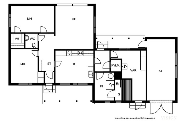- Pinta-alatieto on saatu pääpiirustuksesta mittamaalla johon on huomioitu asuintilat, pesutilat, sauna, varasto, kylmiö. Kohteen pääpiirustuksessa mainitaan pinta-alasta rekennusala 136 m2 johon on sisältynyt myös autotalli. Pinta-aloja ei ole tarkistusmitattu, joten ne saattavat poiketa olennaisestikin nykymääräysten mukaan mittavista pinta-aloista.
