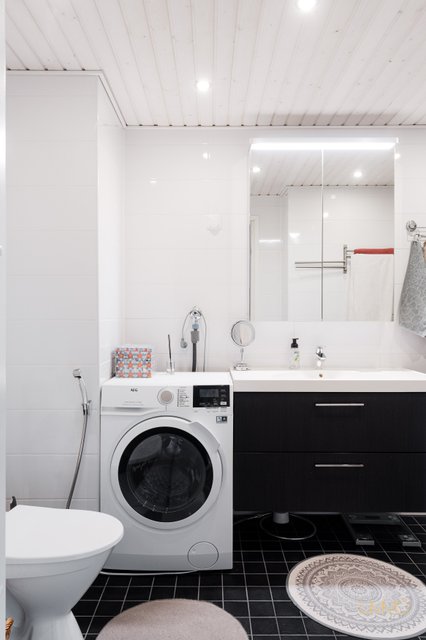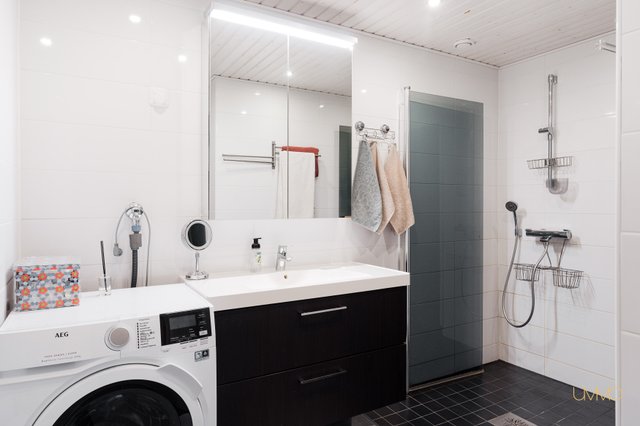 - WC-istuin, suihku, pesukoneliitäntä, lattialämmitys, pesuallas, ja allaskaappi