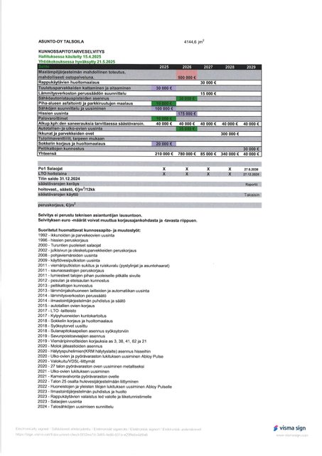 - 2025 -Tuuletusparvekkeiden kattaminen ja aitaaminen - Piha-alueen asfaltointi ja parkkiruutujen maalaus - Sähköjen suunnittelu ja uusiminen - Palovaroittimet - Sokkelin korjaus ja huoltomaalaus 2026 - Sähkölatauspisteiden asennus - Hissien uusinnat - Autotallien- ja ulko-oven uusinta
