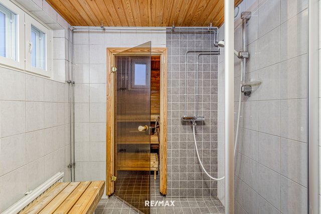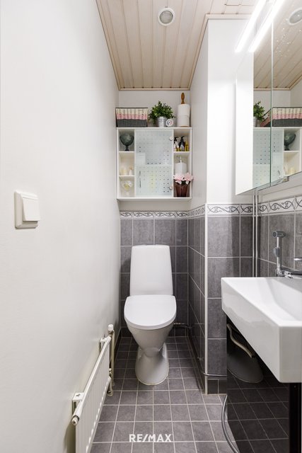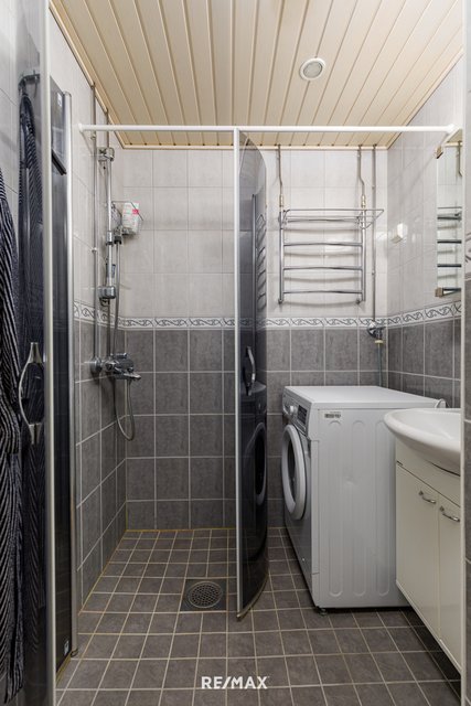 - Suihku, suihkuseinä, pesukoneliitäntä, lattialämmitys, peilikaappi, pesuallas, ja allaskaappi