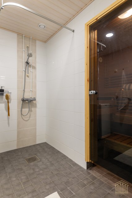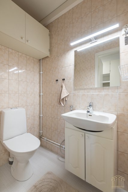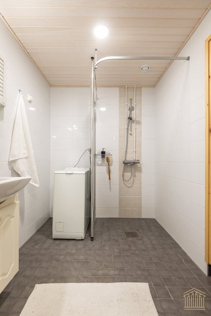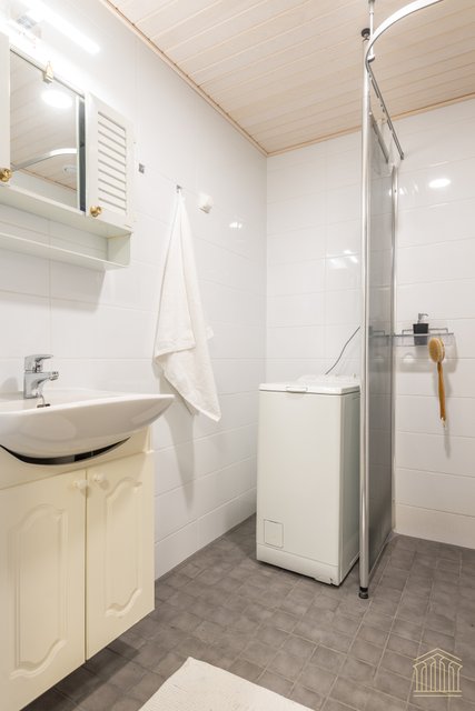 - Suihku, suihkuseinä, pesukoneliitäntä, lattialämmitys (sähköinen), peilikaappi, pesuallas, ja allaskaappi