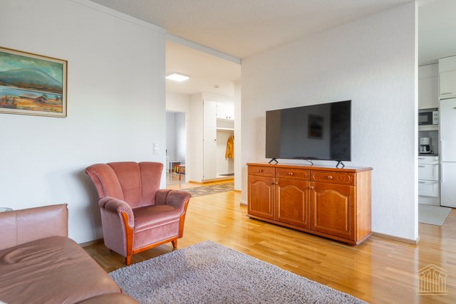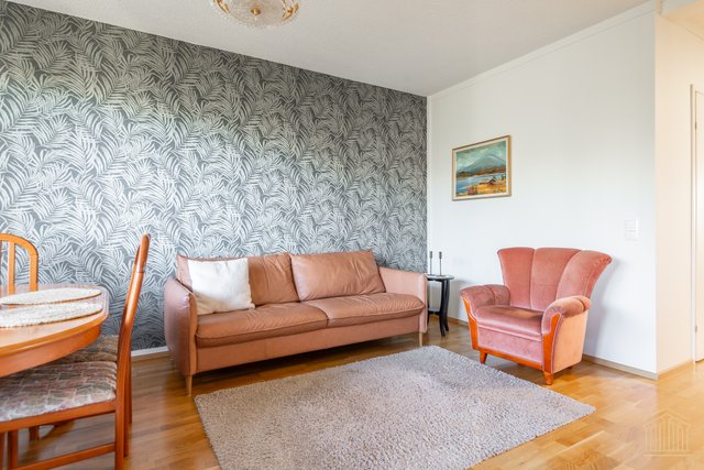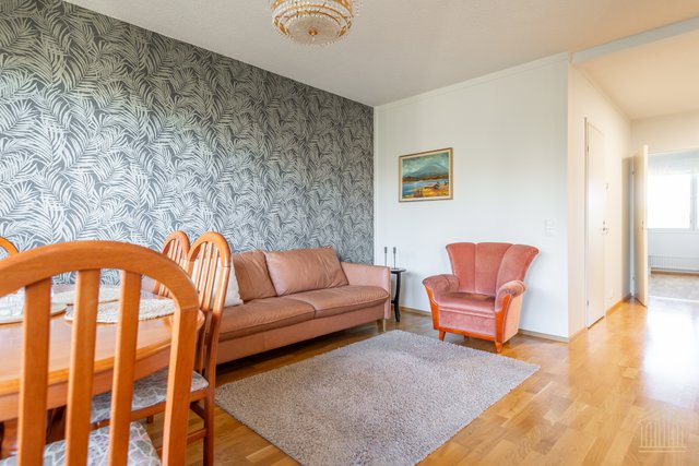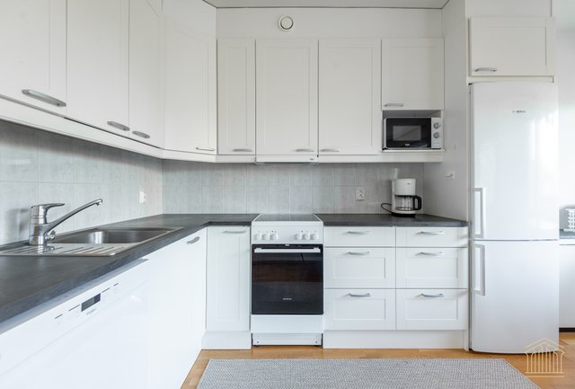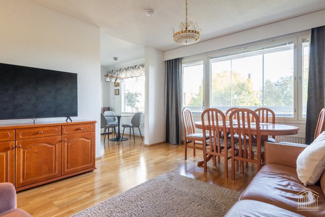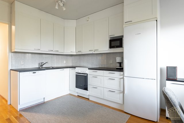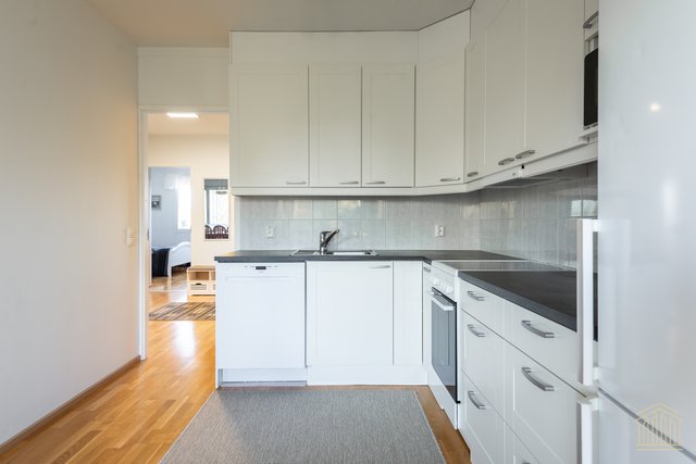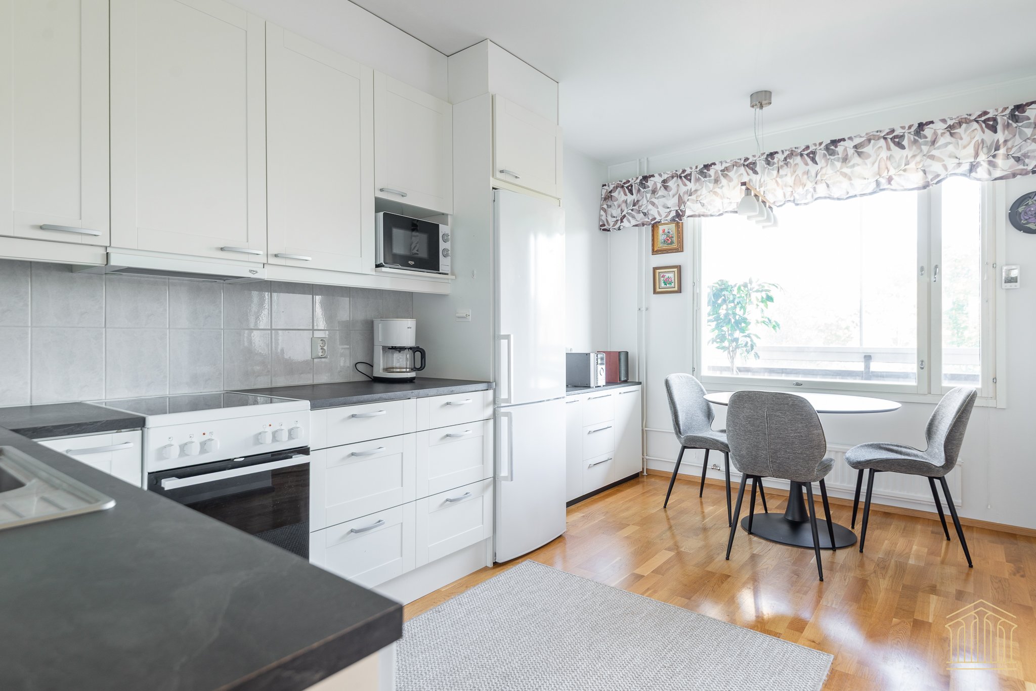 Keittiö on omassa rauhassa, mutta kuitenkin kätevästi lähellä olohuonetta ja lasitettua parveketta, johon pääset nauttimaan aamukahvin jokimaisemassa. Tilavasta olohuoneesta on myös suora käynti parvekkeelle.