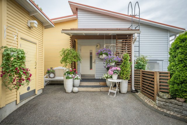 Olohuoneesta on käynti suojaisalle etelään suuntautuvalle patiolle, joka tarjoaa runsaasti aurinkoa ja rauhaa. Makuuhuoneet sijoittuvat pohjoisen puolelle ja ikkunoista avautuu kaunis vehreä näkymä kukkivaan pihaan.