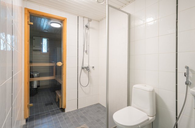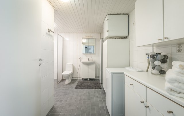 - WC-istuin, suihku, suihkuseinä, pesukoneliitäntä, lattialämmitys, kaappi, peilikaappi, pesuallas, allaskaappi, ja bidee-suihku