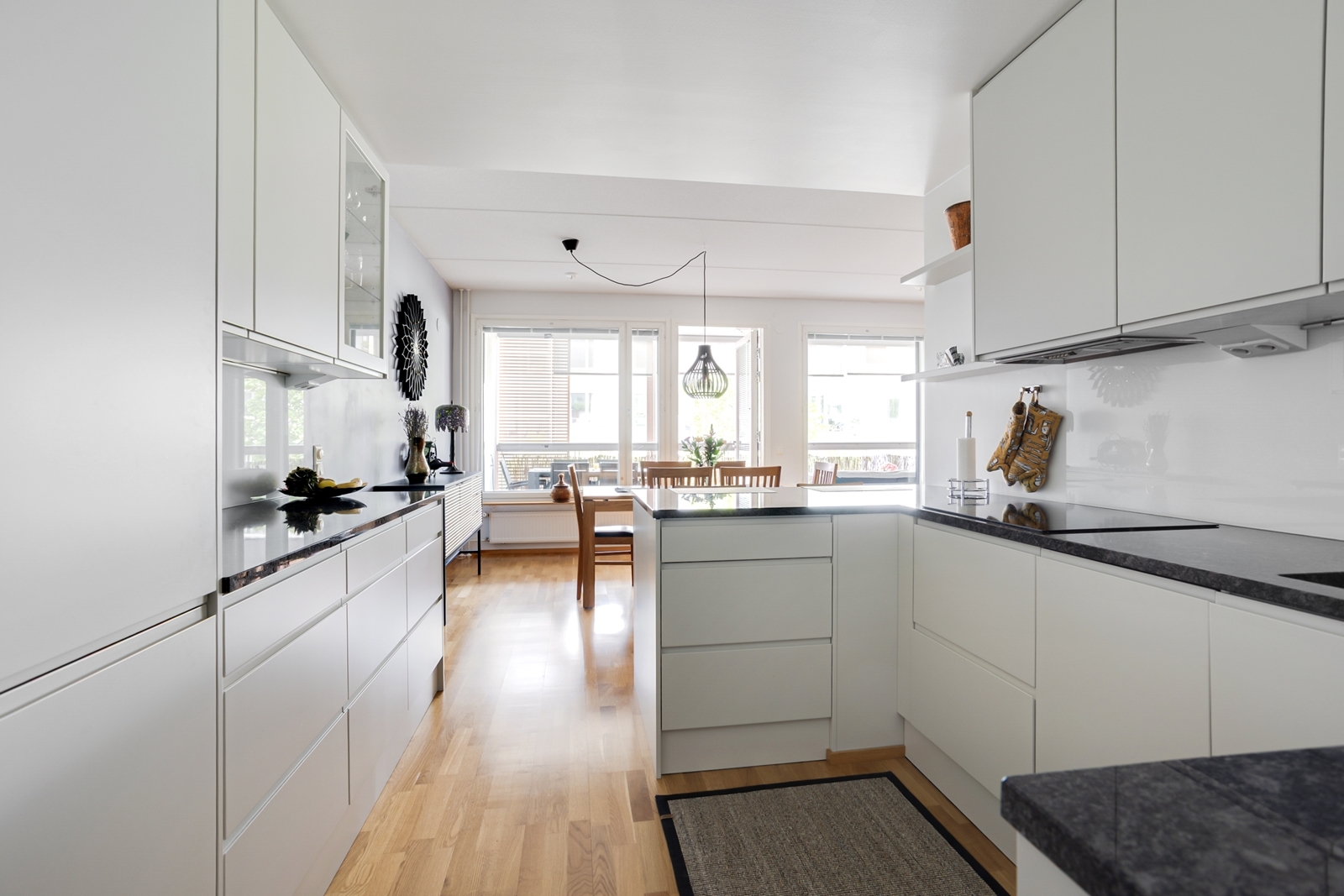 Asunnossa on avara ja toimiva pohjaratkaisu: kaunis keittiö yhdistyy ruokailutilaan ja suureen olohuoneeseen, jotka yhdessä muodostavat kodin viihtyisän keskipisteen. Tilasta on suora käynti suurelle länsisuuntaiselle terassiparvekkeelle, jossa voit viettää aikaa isommankin ja nauttia kesästä.