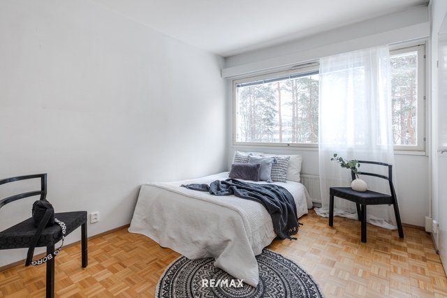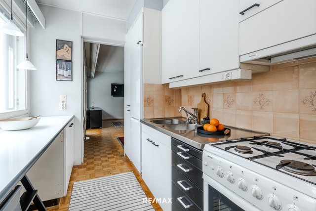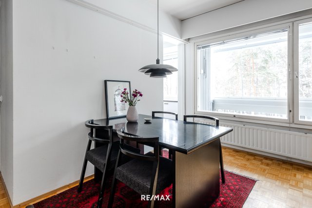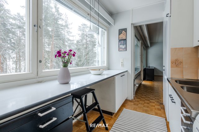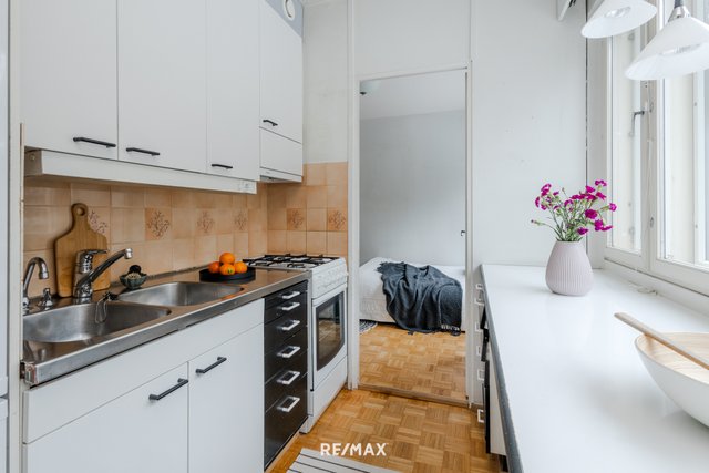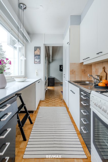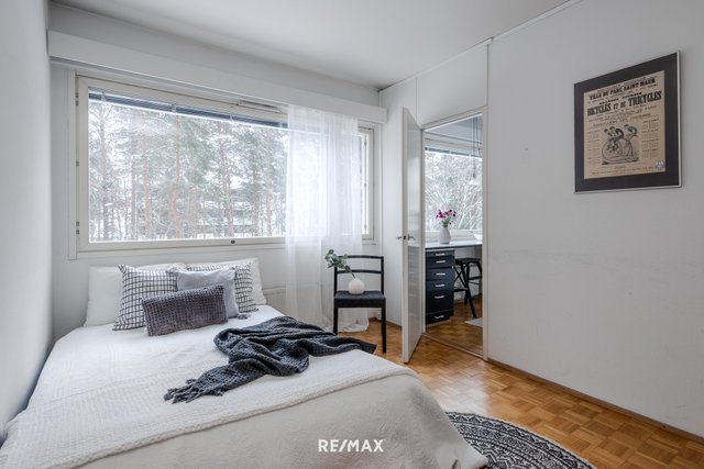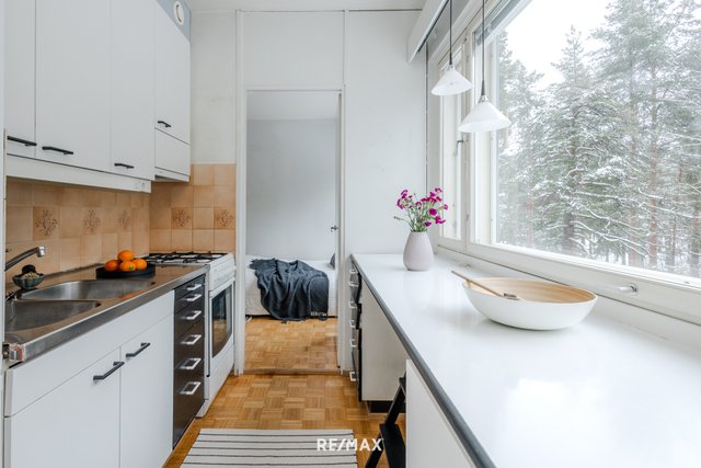 Asunnon pohjaratkaisu on käytännöllinen; makuuhuone ja olohuone ovat asunnon eri puolilla ja niiden välissä ovat keittiö ja kylpyhuone. Asuntoon tulee runsaasti valoa koko asunnon levyisistä 60-luvun nauhaikkunoista. Tämä näppärä kaksio sijaitsee kolmannessa kerroksessa ja sen lasitetulta parvekkeelta avautuu kaunis puistonäkymä. Vaatehuone on eteisessä aivan makuuhuoneen vieressä.