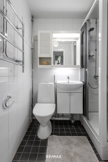 - WC-istuin, suihku, suihkukaappi, pesukoneliitäntä, peilikaappi, pesuallas, allaskaappi, bidee-suihku, ja lattialämmitys