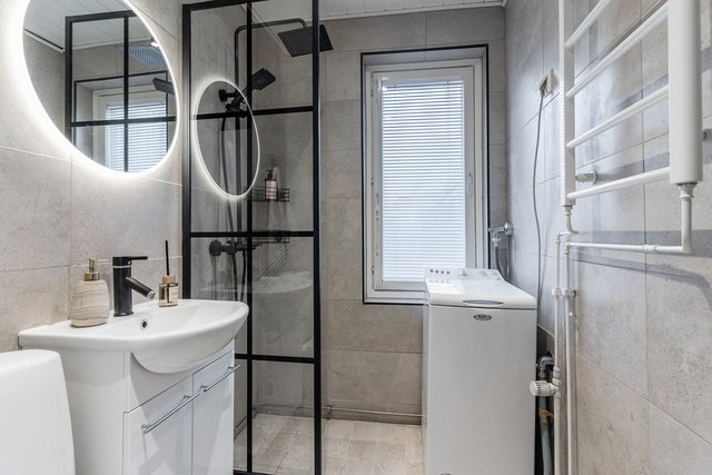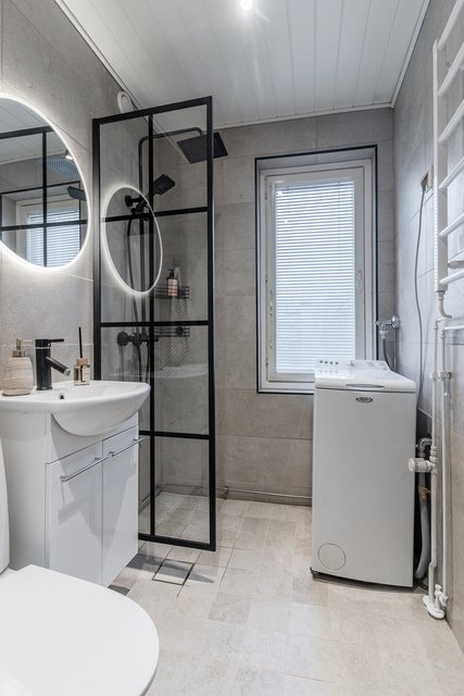 - WC-istuin, suihku, suihkuseinä, kuiv.teline (vesikierto), ikkuna (Vesikierto), peili, kuivauskaappi, ja pesukoneliitäntä