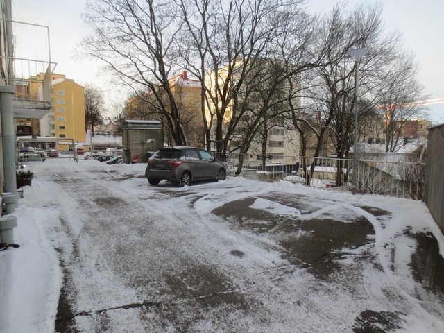 Rauhallinen katuosuus ja keittiö/makuuhuone pihalle.