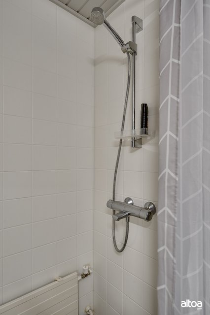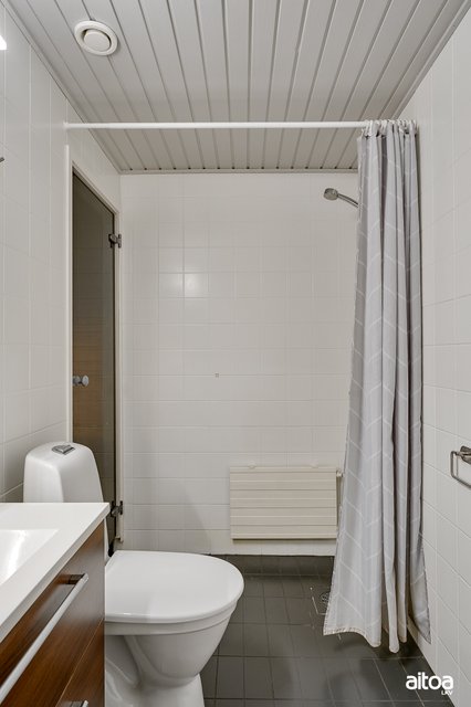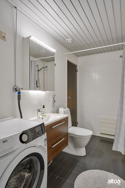 - WC-istuin, suihku, peilikaappi, allaskaappi, pesuallas, bidee-suihku, ja pesukoneliitäntä