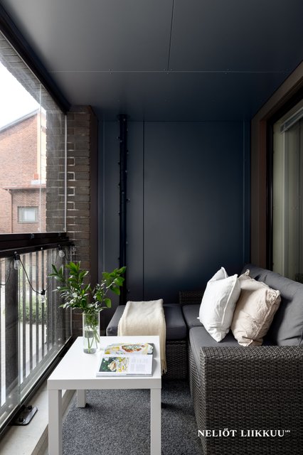 Kodin suuri lasitettu parveke toimii käytännössä lisähuoneena - täydellinen paikka nauttia aamukahvista tai etätyöskentelystä keväästä myöhäiseen syksyyn.