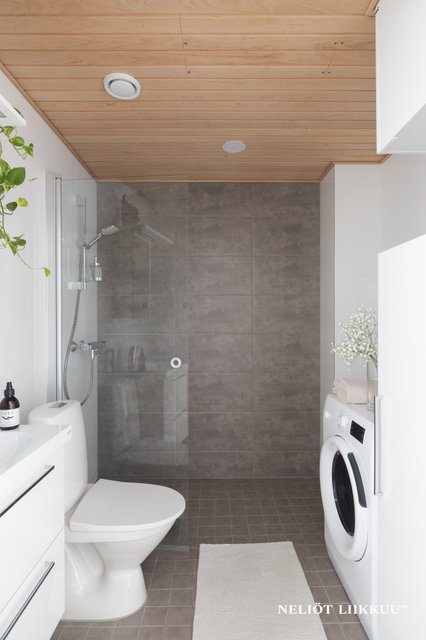 - WC-istuin, suihku, suihkuseinä, pesukoneliitäntä, lattialämmitys, peilikaappi, ja kylpyhuonekaapisto