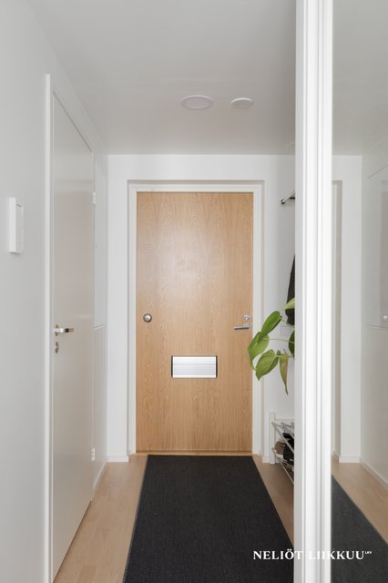 Lattiat ovat kauttaaltaan kaunista parkettia, joka tuo lämpöä ja yhtenäistä ilmettä asuntoon. Säilytystilaa löytyy yllättävän paljon: eteisen kaapistot tarjoavat runsaasti käytännöllistä tilaa, joka helpottaa siistin arjen ylläpitoa. Tilava ja moderni kylpyhuone on laatoitettu kauttaaltaan, ja siellä on oma käytännöllinen tila pyykinpesukoneelle.