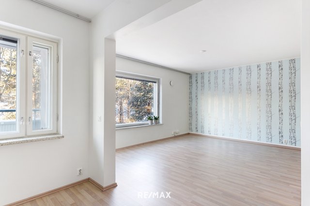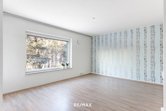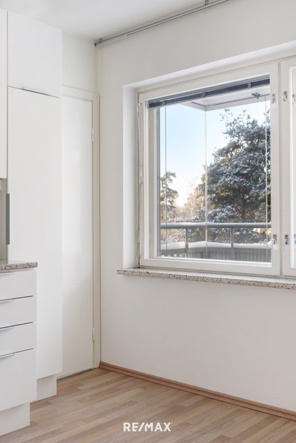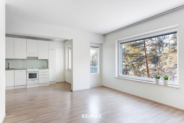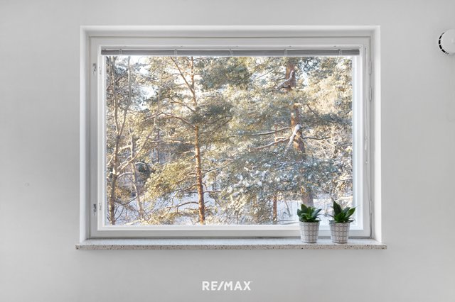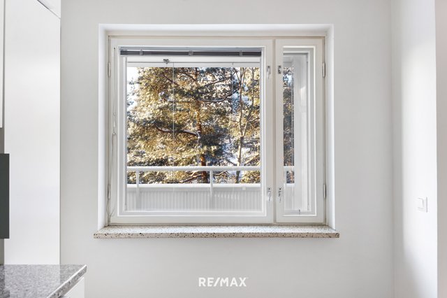 - Olohuoneen suuri ikkuna on kuin postikortti metsäiseen maisemaan. Tila jatkuu sujuvasti keittiöstä olohuoneeksi ja tuntuukin siksi suuremmalta. Olohuoneesta on kulku lasitetulla parvekkeelle.